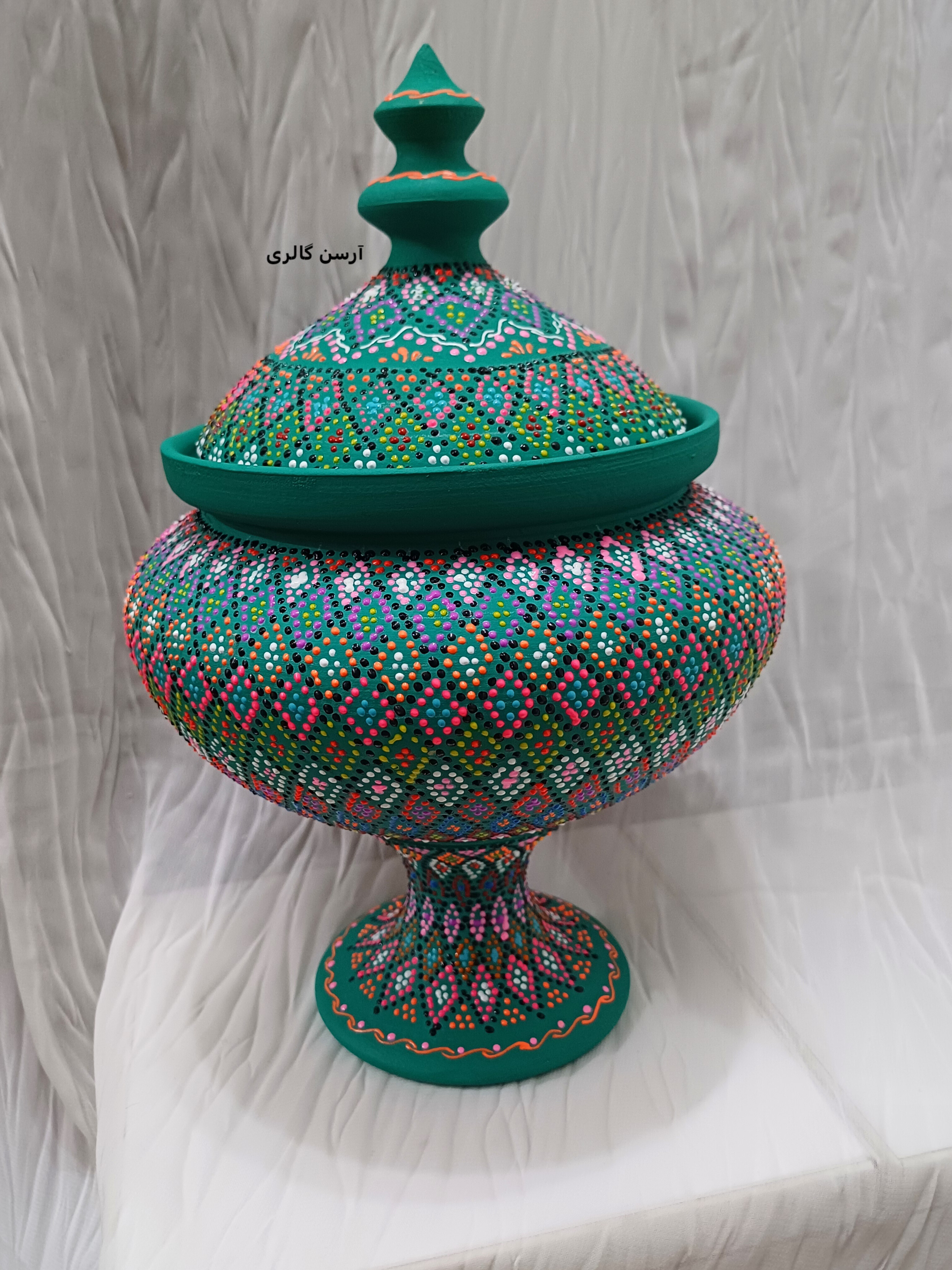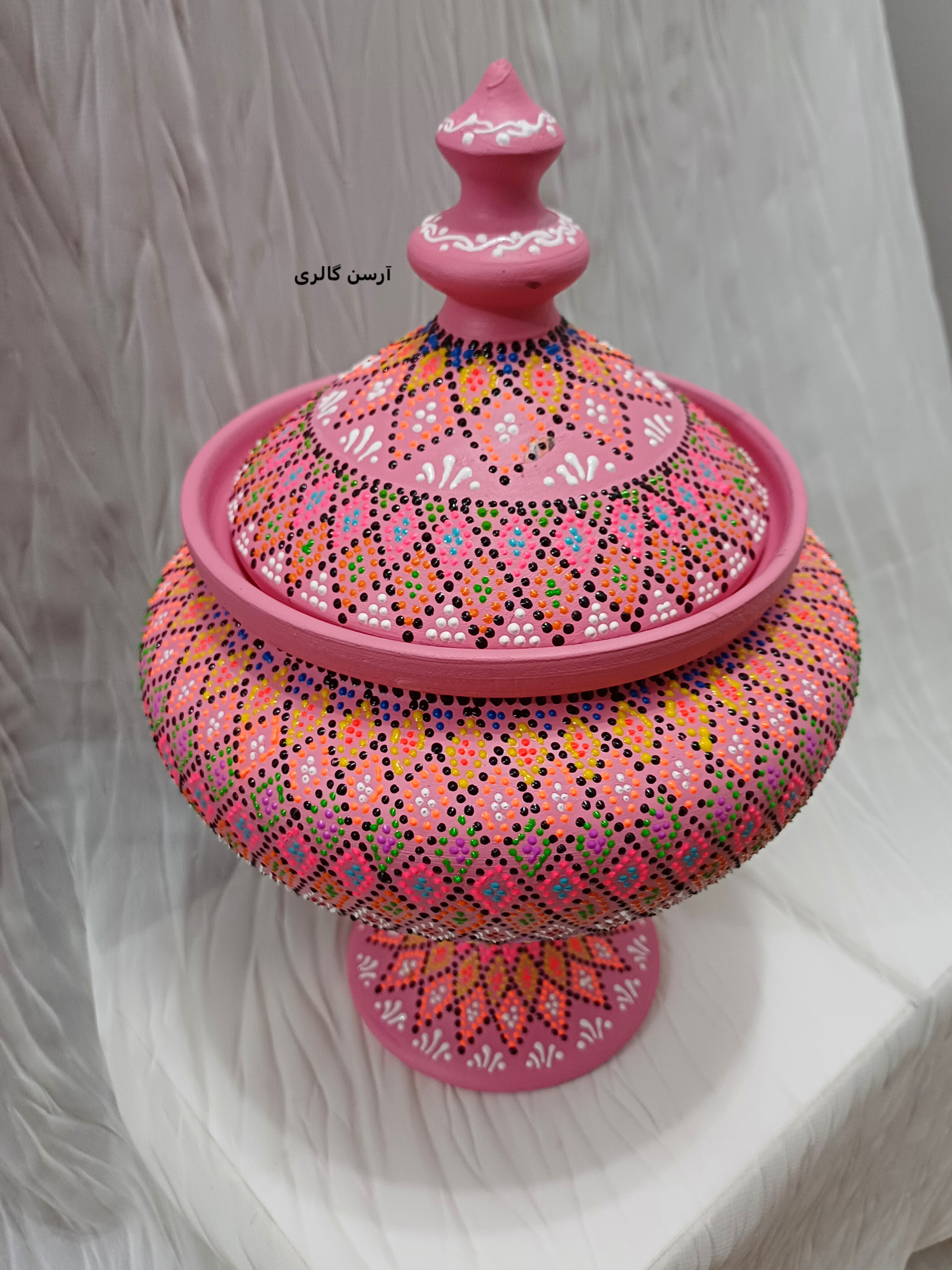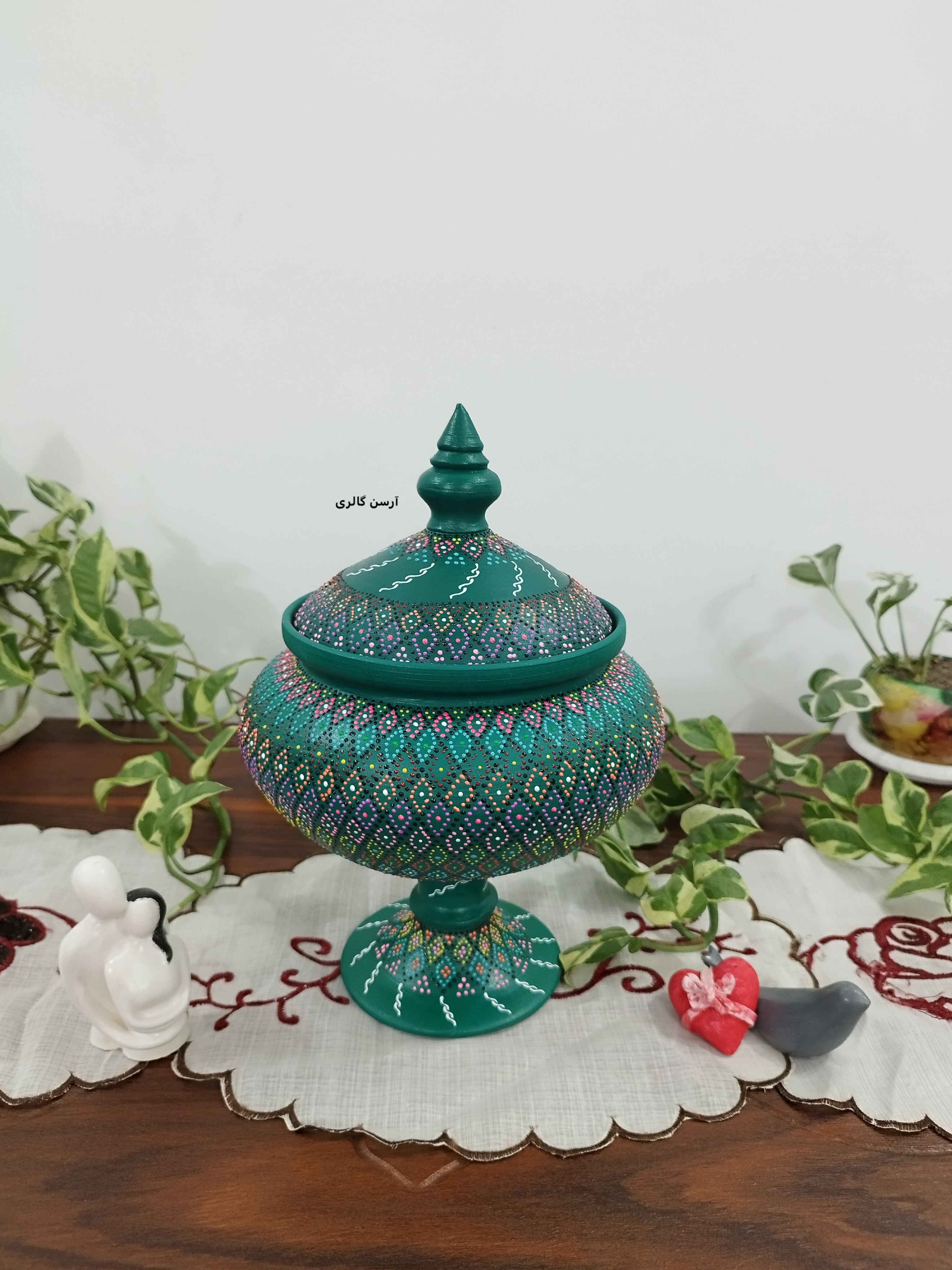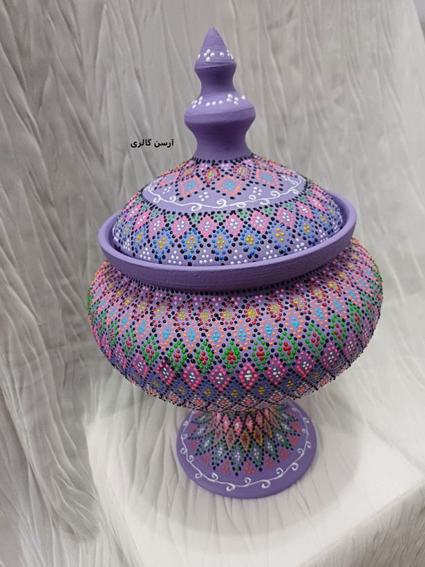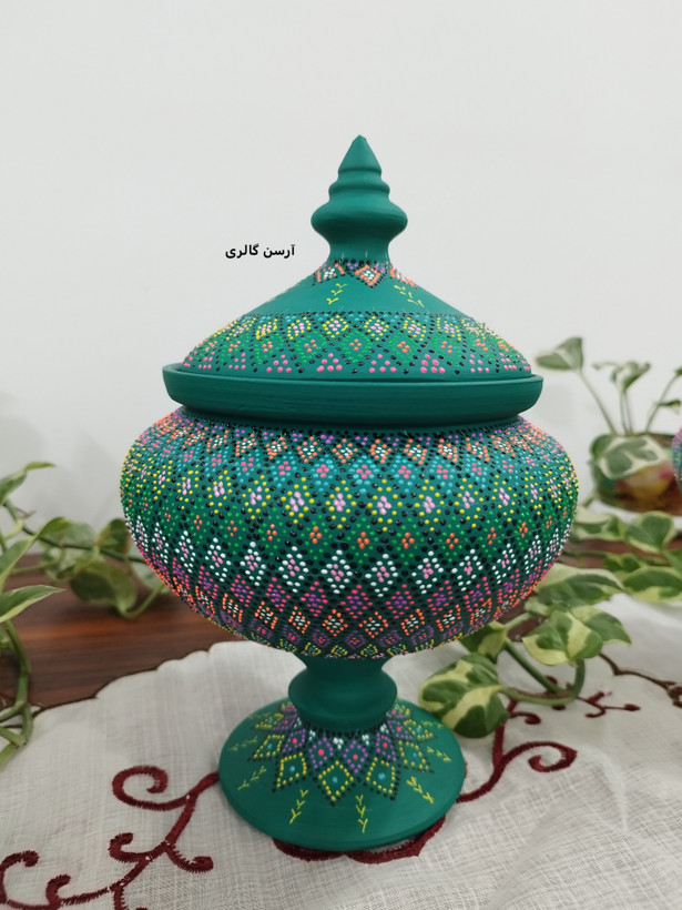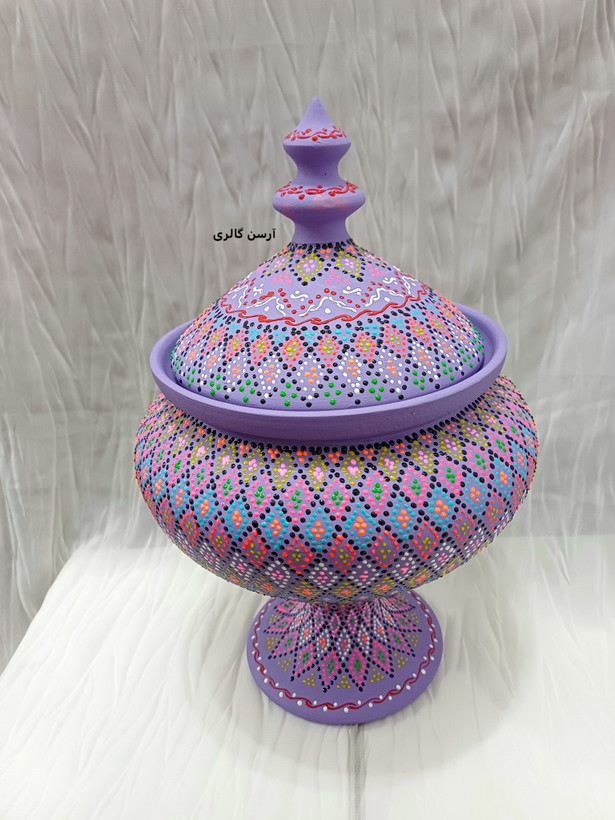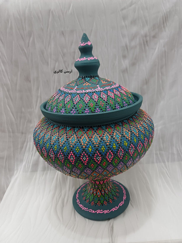 شکلاتخوری تک پایه یه ظرف سفالی شیک و جمعوجوره که روی بدنهاش با هنر نقطهکوبی، طرحهای رنگی و جذاب کار شده. این ظرف یه پایه مرکزی داره که باعث میشه روی میز یا پیشخوان به زیبایی جلوه کنه و فضای زیادی هم اشغال نکنه. مناسب پذیرایی از مهمونا، گذاشتن شکلات، آجیل یا حتی دکوری کردن میز عسلی و کنسول. چون ضدآب و قابل شستوشوعه ، هم کاربردیه هم تزیینی و به خاطر دستساز بودن، هر کدومش با بقیه فرق داره و خاص خودته.