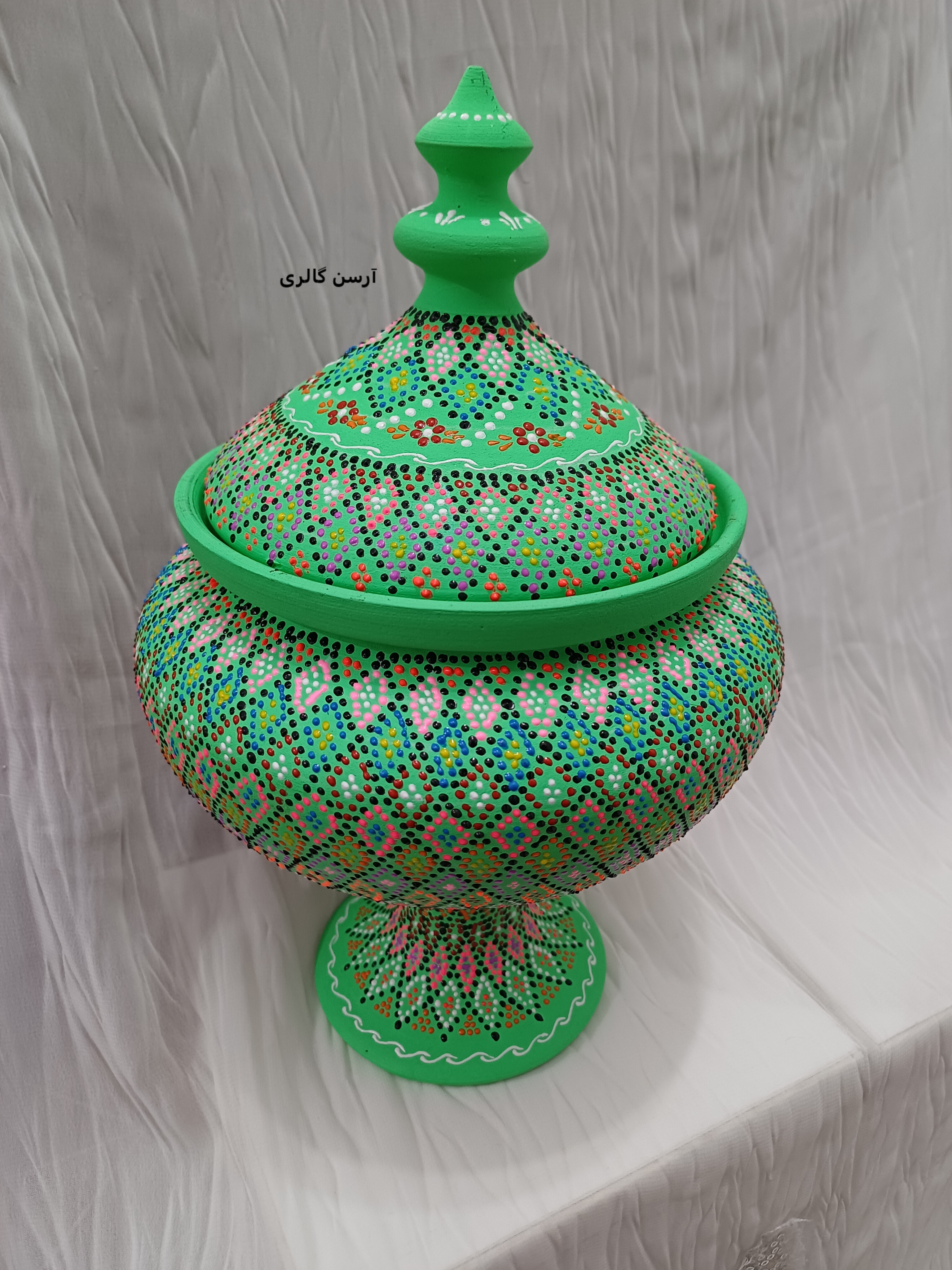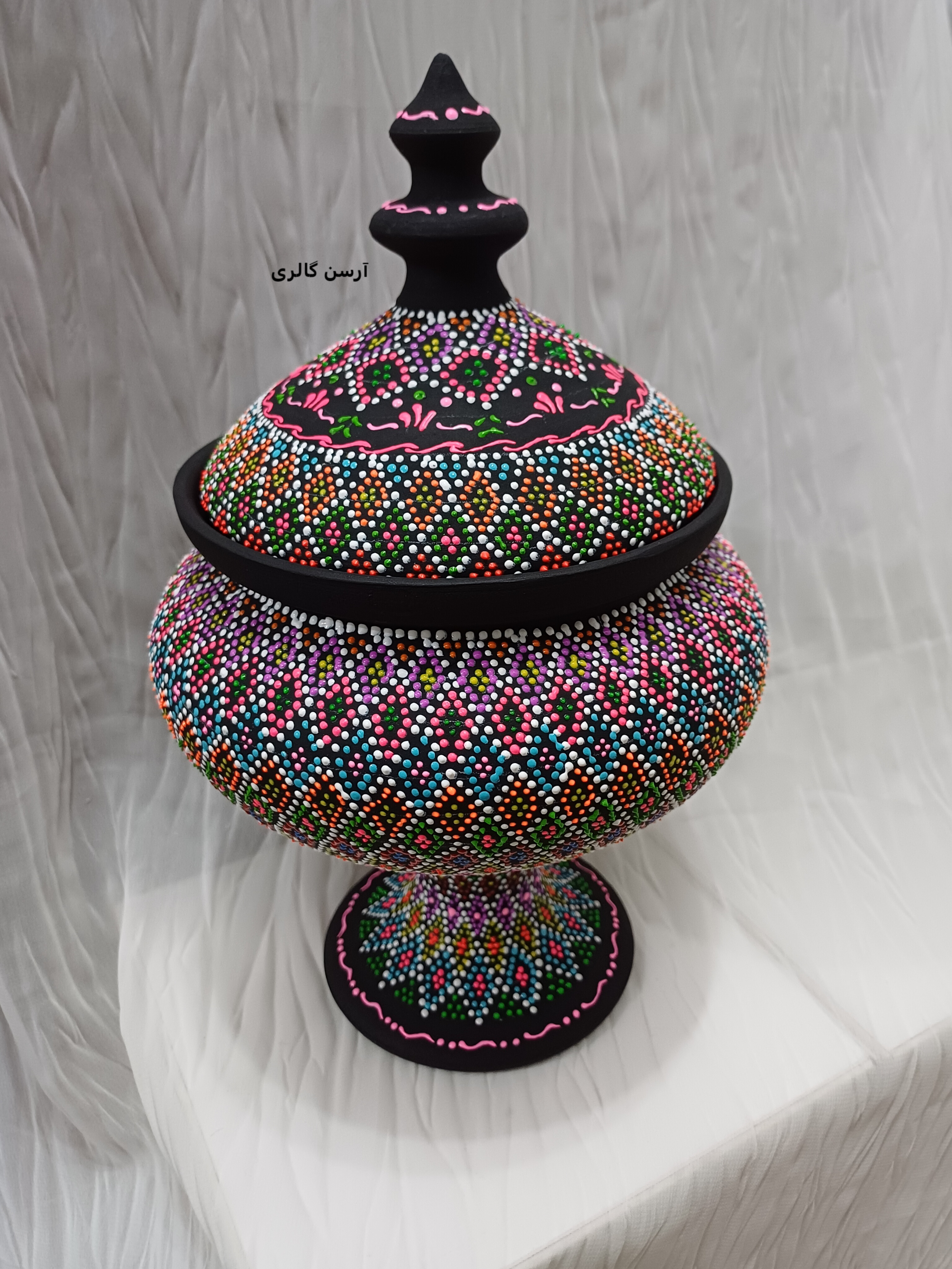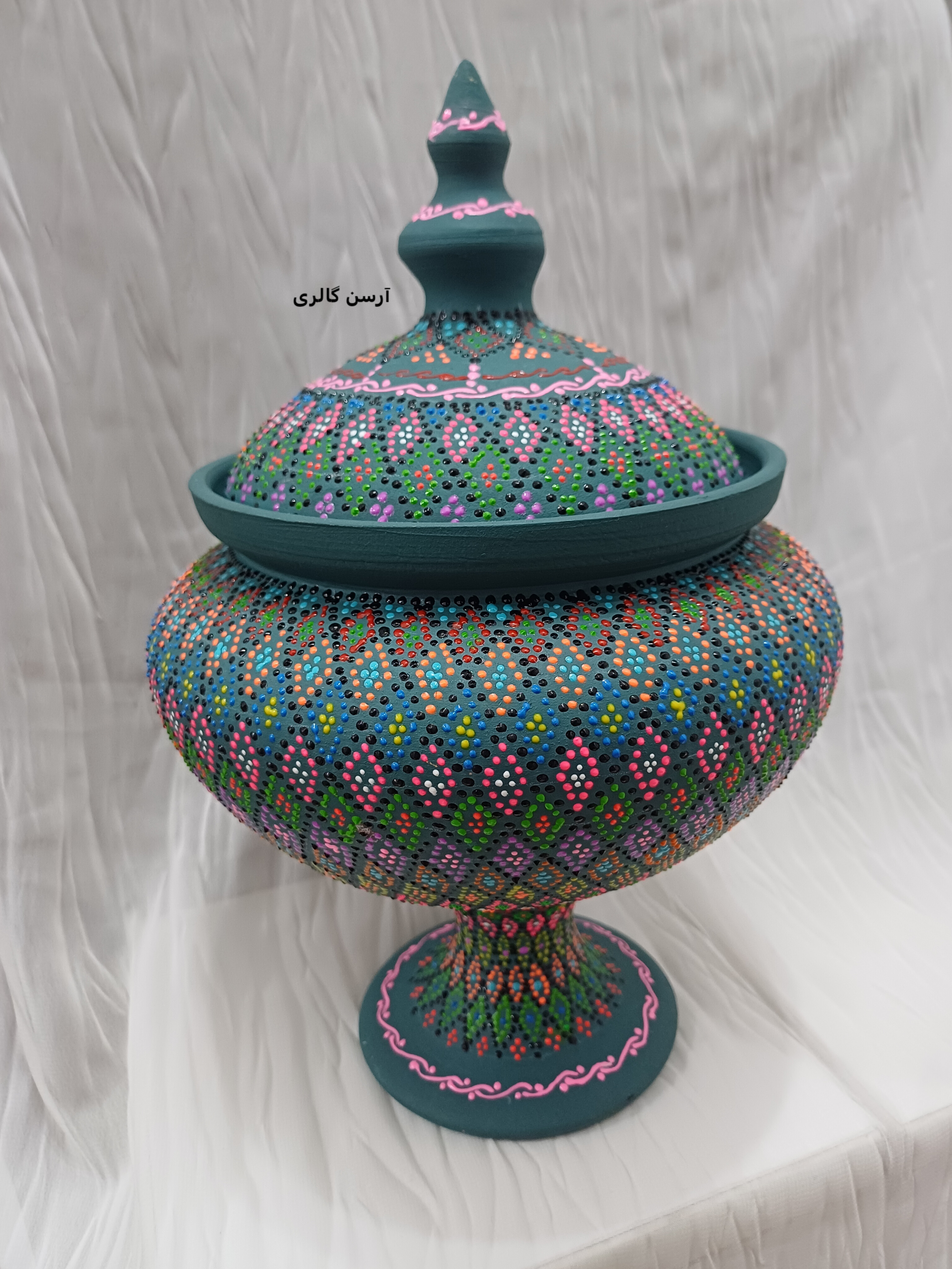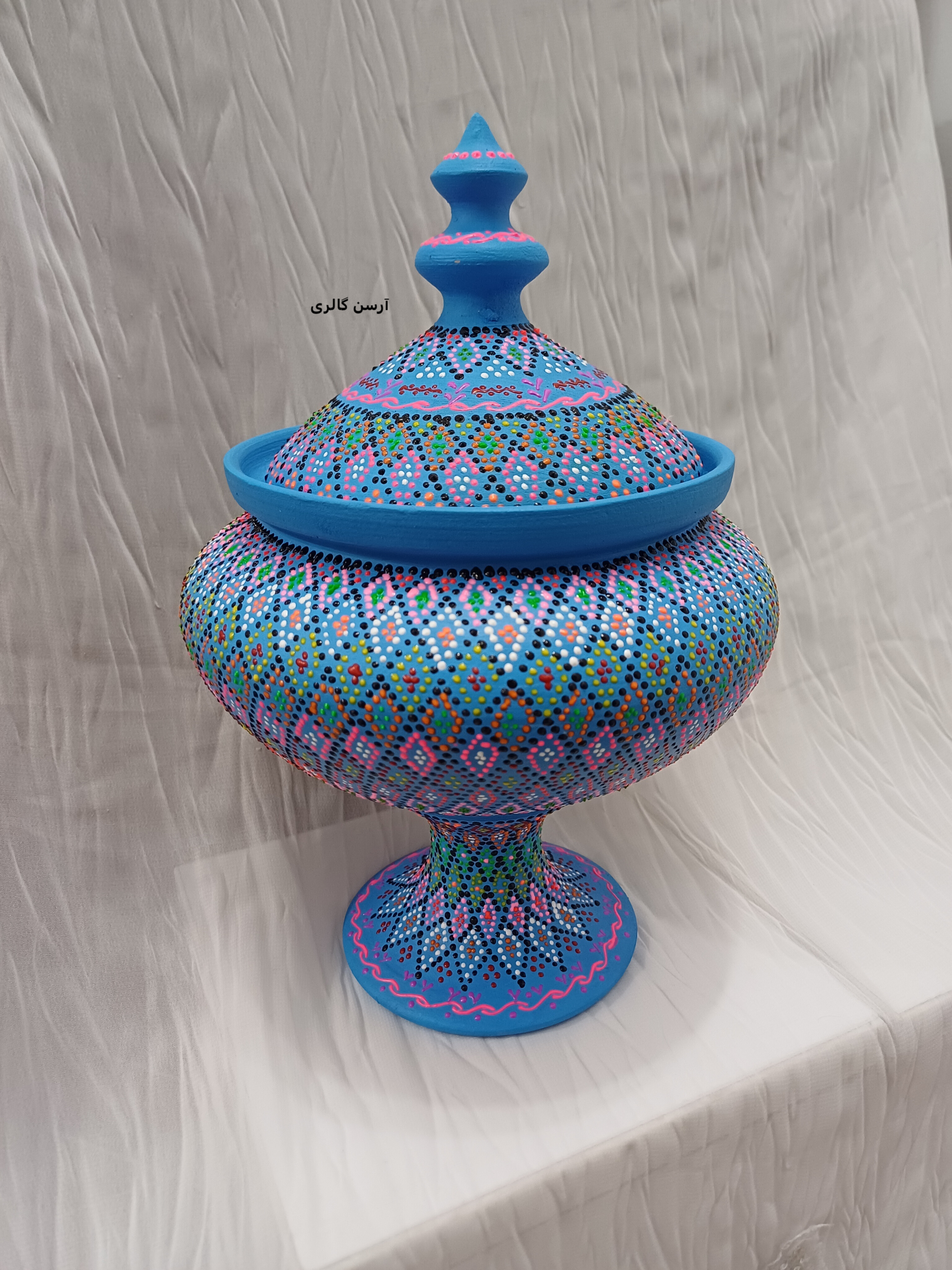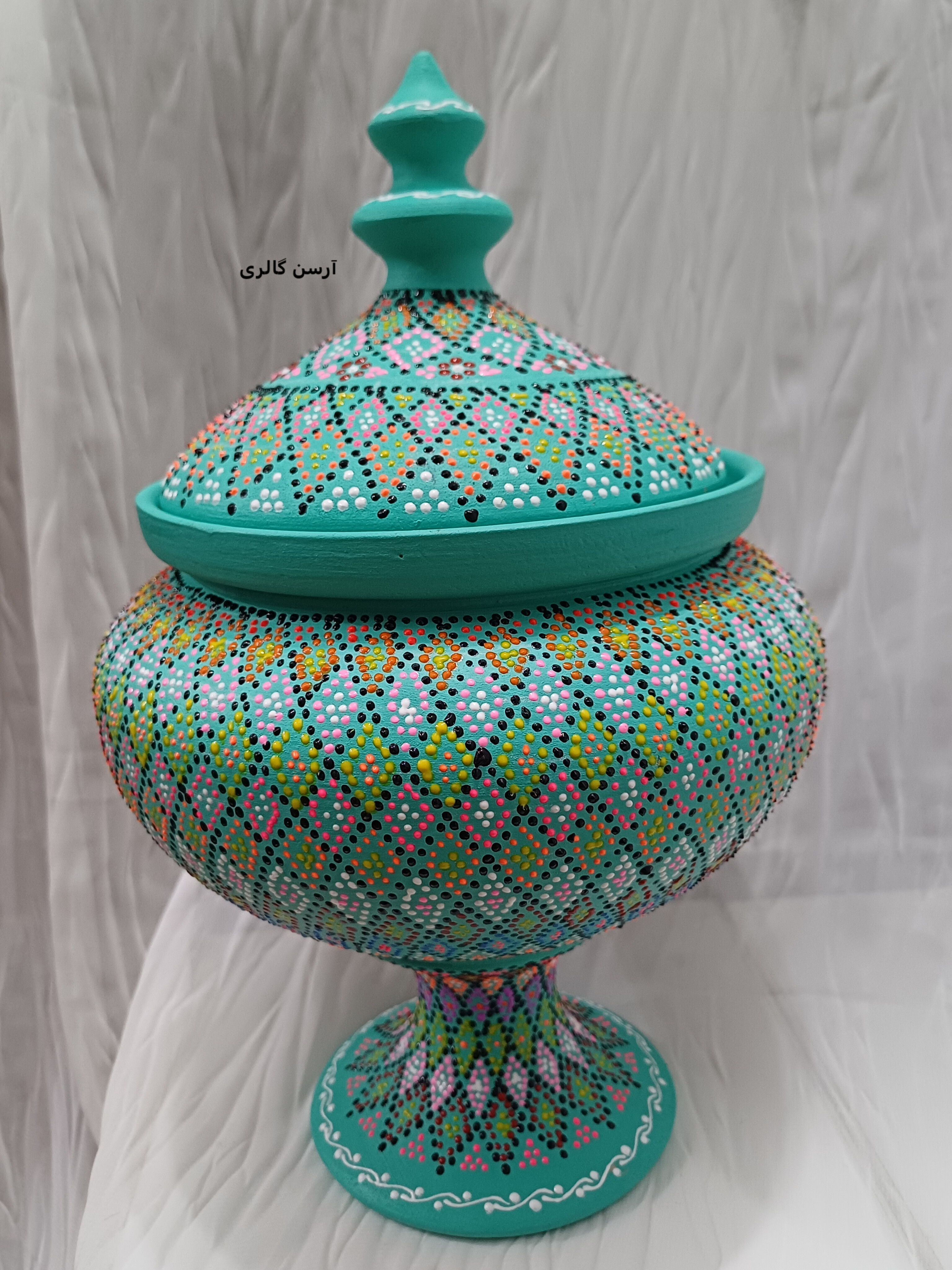 شکلاتخوری تک پایه یه ظرف سفالی شیک و جمعوجوره که روی بدنهاش با هنر نقطهکوبی، طرحهای رنگی و جذاب کار شده. این ظرف یه پایه مرکزی داره که باعث میشه روی میز یا پیشخوان به زیبایی جلوه کنه و فضای زیادی هم اشغال نکنه. مناسب پذیرایی از مهمونا، گذاشتن شکلات، آجیل یا حتی دکوری کردن میز عسلی و کنسول. چون ضدآب و قابل شستوشوعه ، هم کاربردیه هم تزیینی و به خاطر دستساز بودن، هر کدومش با بقیه فرق داره و خاص خودته.