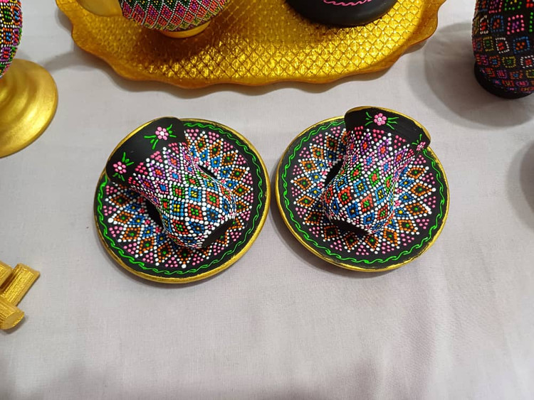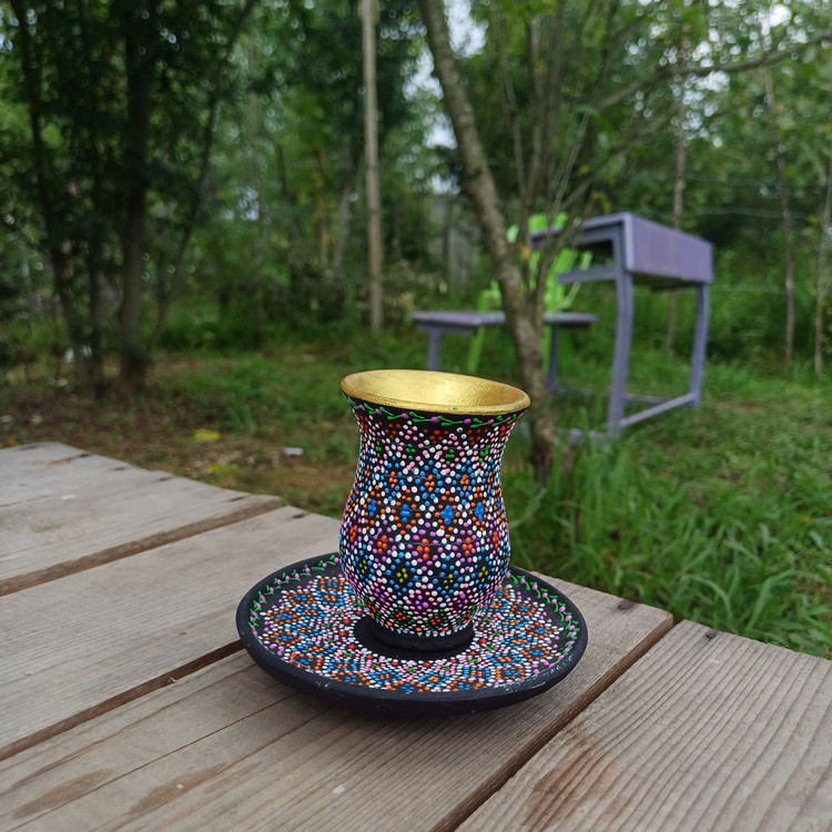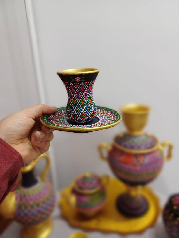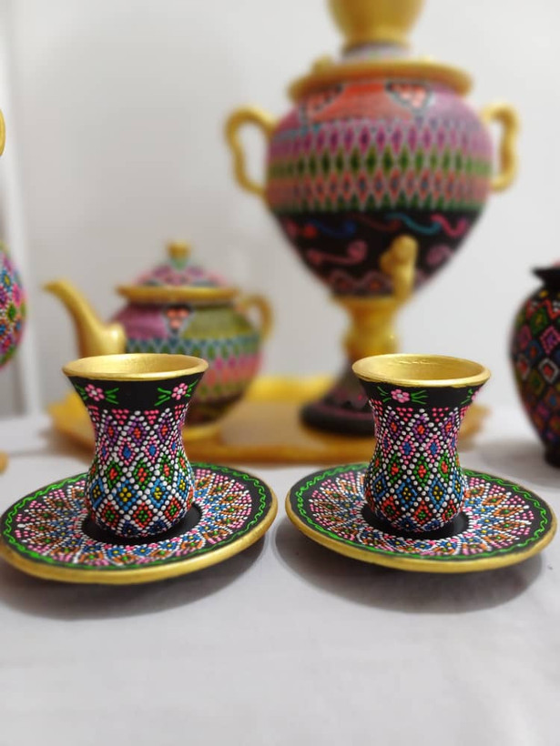 این ست استکان و نعلبکی با تکنیک نقطهکوبی و رنگآمیزی دستی روی سفال خام ساخته شده و جلوهای خاص و هنری به دکور خونه یا محل کارتون میده.